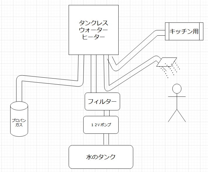 プロパンガスを使って、タンクレスヒーターを通して、お湯を出します。